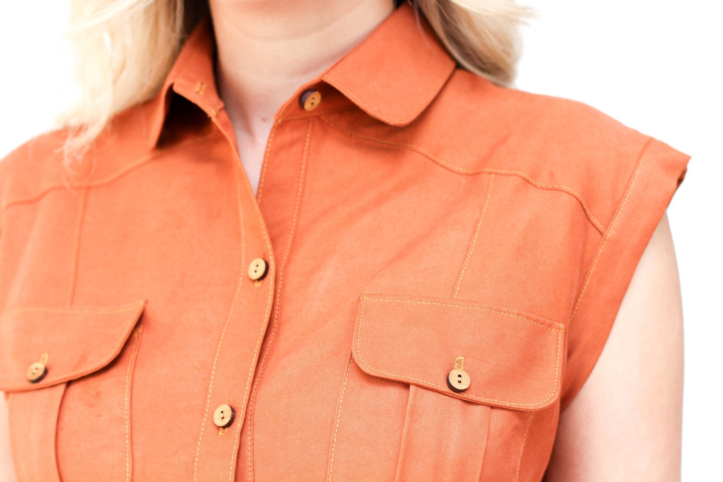 Modern utility style shirt dress with classic tailoring techniques. Pattern features princess seams, drop shoulders, pleated breast pockets, an A-line skirt with roomy statement pockets, collar and stand.