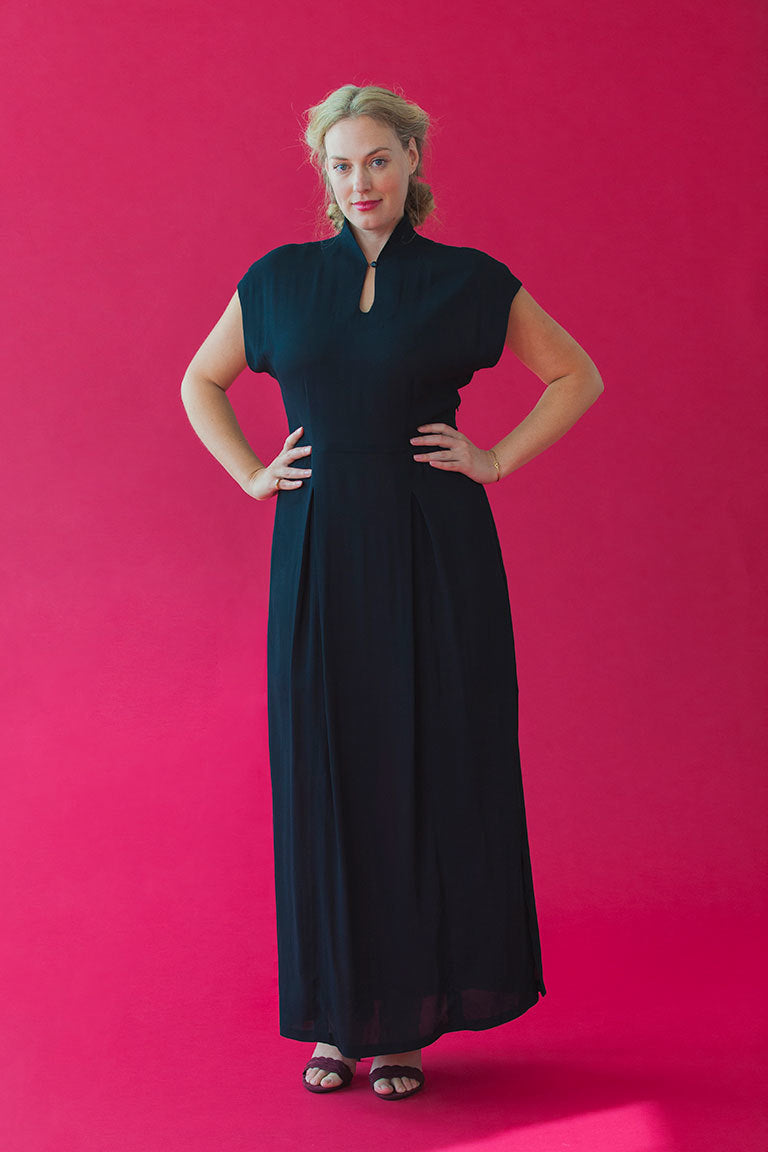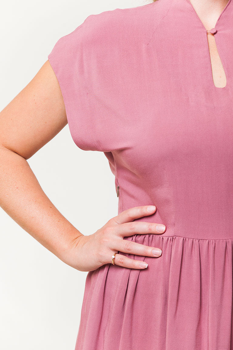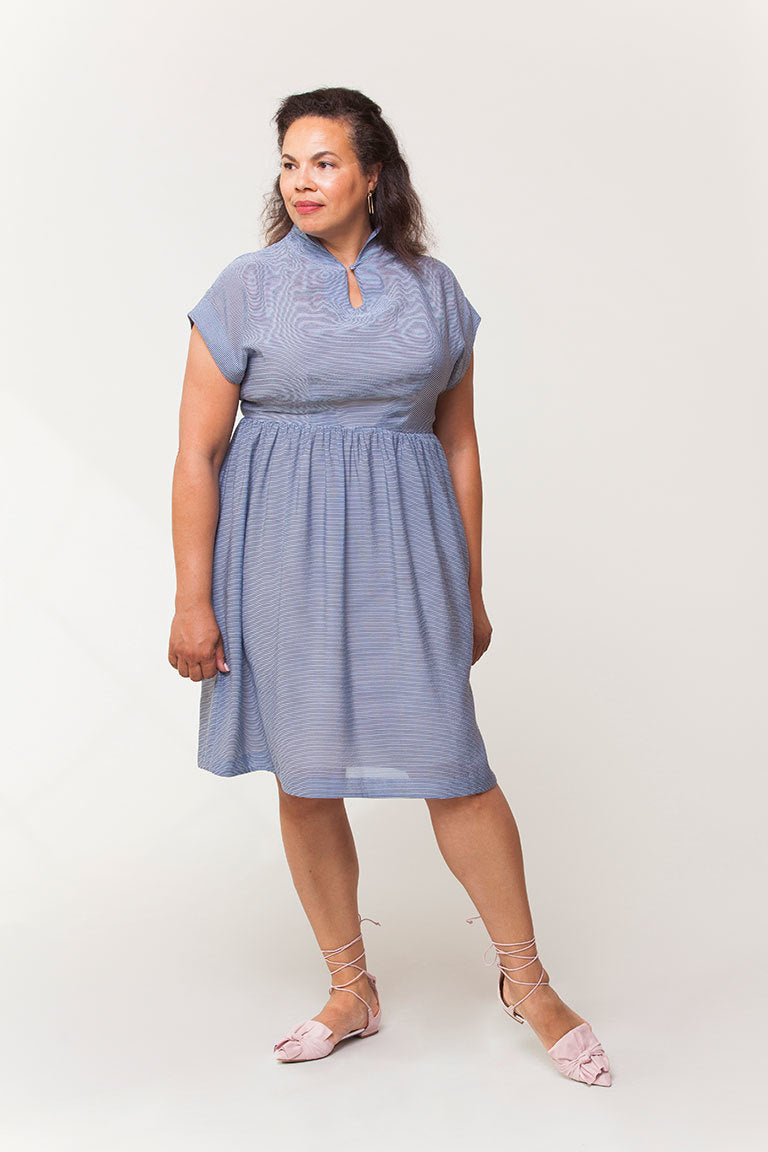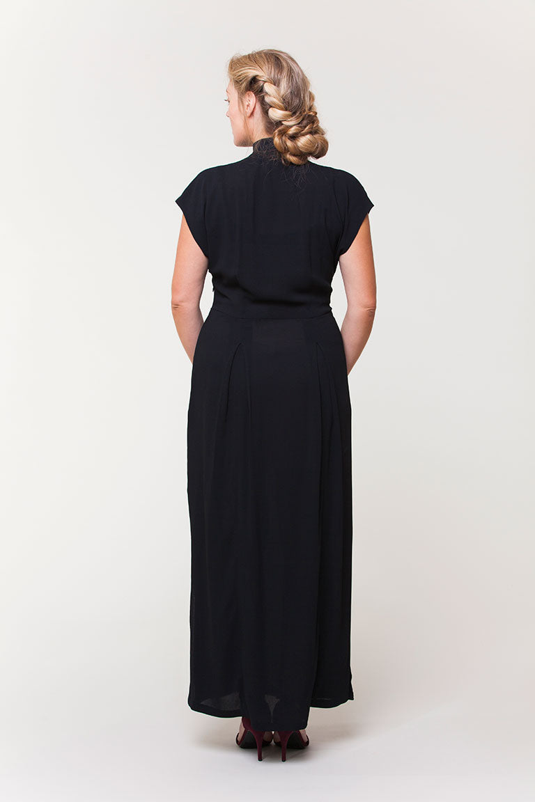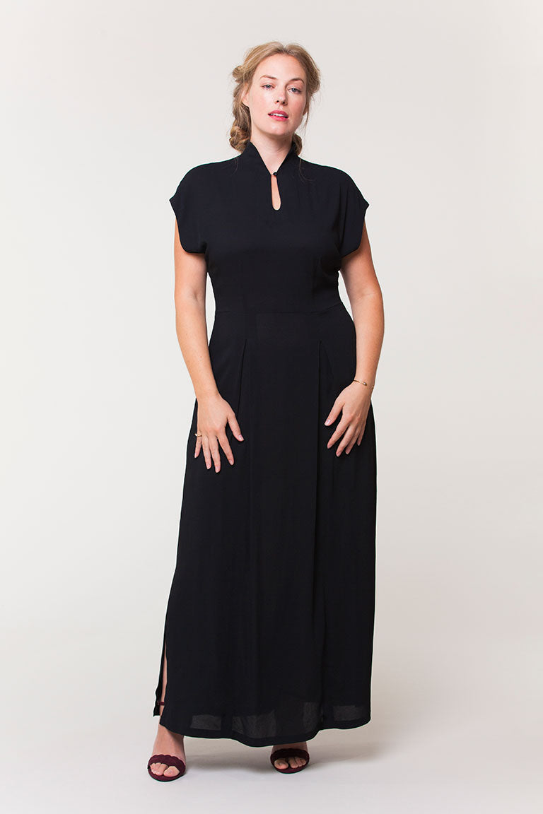 Prudence is a sumptuous dress that will expand your sewing knowledge and wardrobe. With romantic bodice details, such as a mandarin collar, front neckline keyhole, and dolman sleeves, this dress is sure to garner some attention.